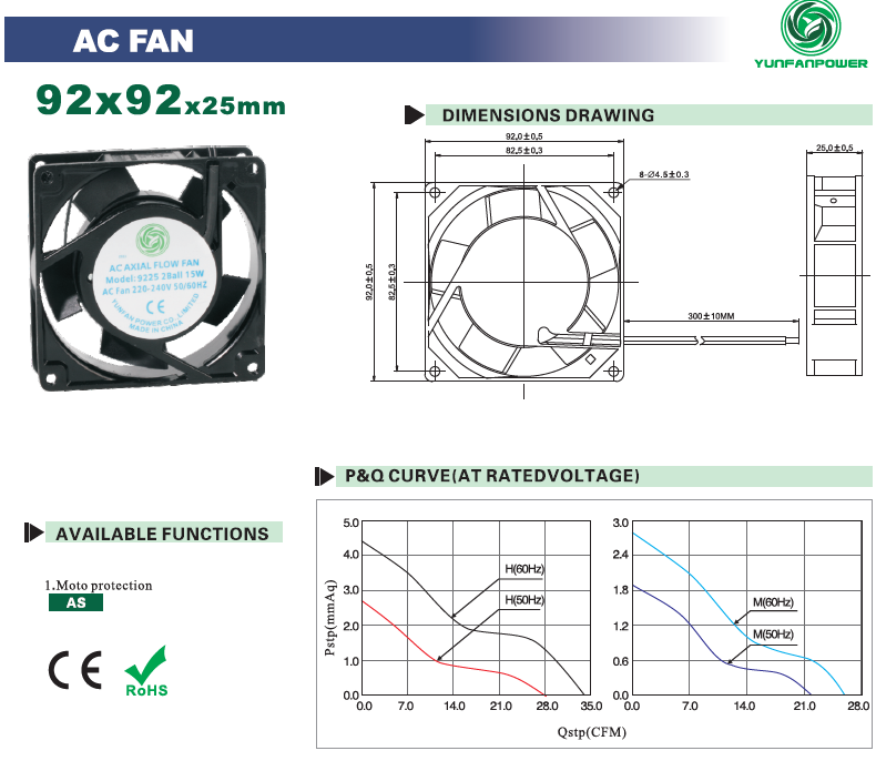| YFA9225S2H | 50/60 | 0.07/0.06 | 2300/2800 | 0.79/0.96 | 2.7/4.4 | 34/40 | ||